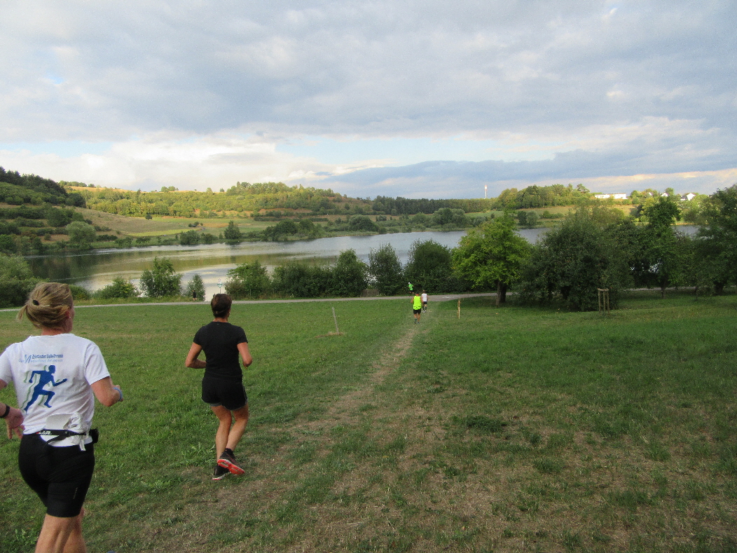 In Daun angekommen, hiess es noch etwas warten und die Zeit mit einem Schnack sinnvoll nutzen, bis schließlich pünktlich um 18h der Startschuß zum Halbmarathon fiel. Von Daun über den Mosel Maare Radweg, durch die Eifeler Berge, um das Schalkemehrener Maar und weiter Richtung Gillenfeld. Das stand für die nächsten knapp 2Std auf dem Programm. Außerdem war ich als Paceläufer von Andrea mit dem Ziel „gebucht“, eine Zeit mindestens von 2:06h für die Halbmarathon zu laufen, besser aber unter 2h zu bleiben. Für uns hieß das, eine Pace von 5:40min/km zu halten, egal ob Eifeler Berge, Eifeler Täler oder Eifeler Ebenen… Naja, Berge und damit Steigungen gab es genug. Außerdem hat die Erkenntnis bestand: wo es rauf geht, geht es auch irgendwann wieder runter und etwas Ebene war auch vorhanden, also los…