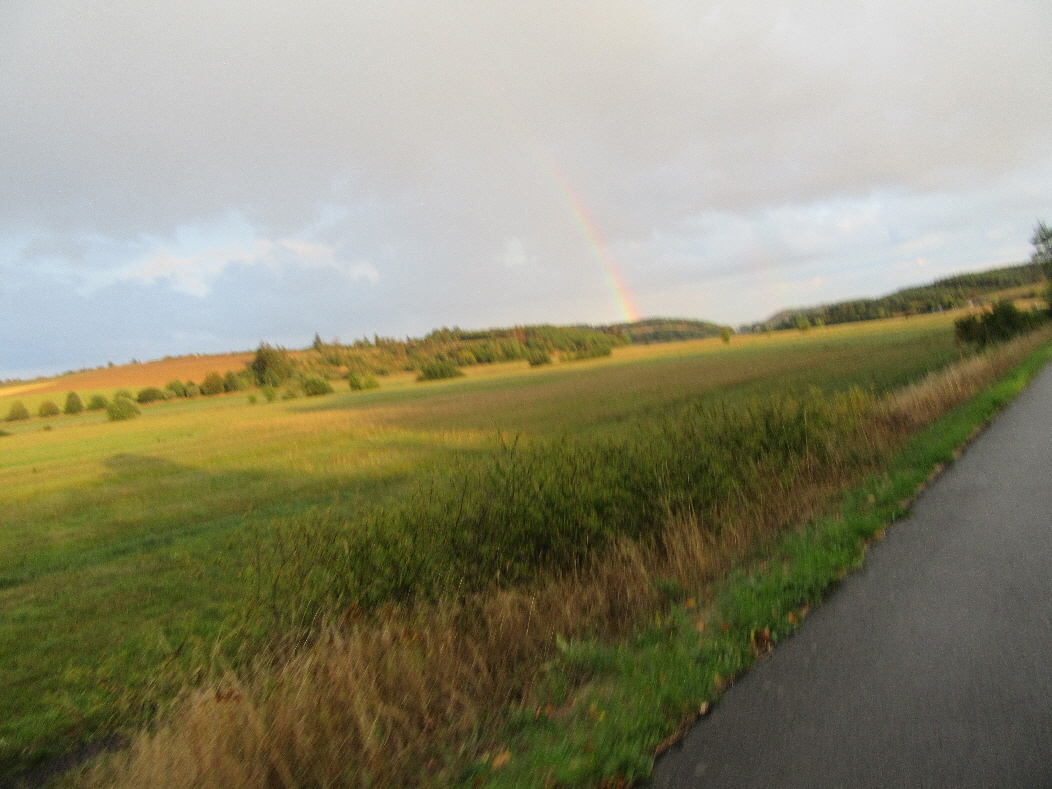 Bot die Strecke einen perfekten Panoramablick in die unterschiedlichen Eifellandschaften, dachte sich der Wettergott Petrus vermutlich, dass er es dem Ausblick gleich tuen müsse und variierte auch das Wetter. Von warmen Sonnenpassagen über Wind bis hin zu Regen war alles in diesen knapp 2 Stunden drin, was das Wetter -und eben auch in der Eifel- ausmacht. Dabei folgte das mega geile irgendwo bei km17. Es gab erst einen perfekten Panoramablick in die weite, bergige Eifellandschaft mit Sonne in der Ferne und diesigem Wetter sowie zum Abschluss einen perfekten Regenbogen. Was will das Läuferherz mehr, dachte ich noch so bei mir.