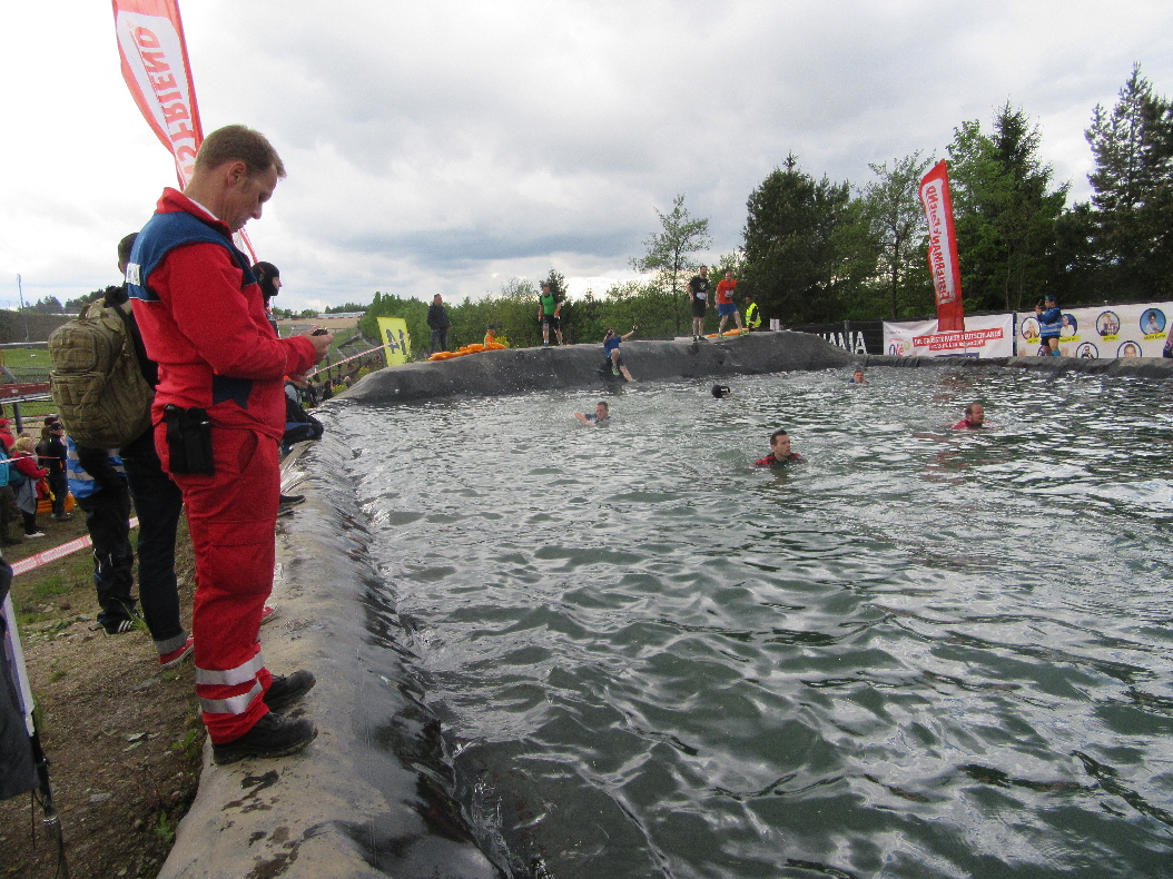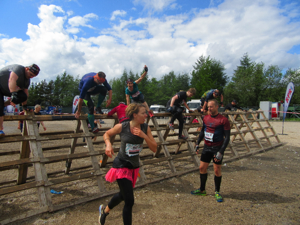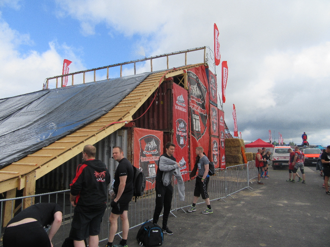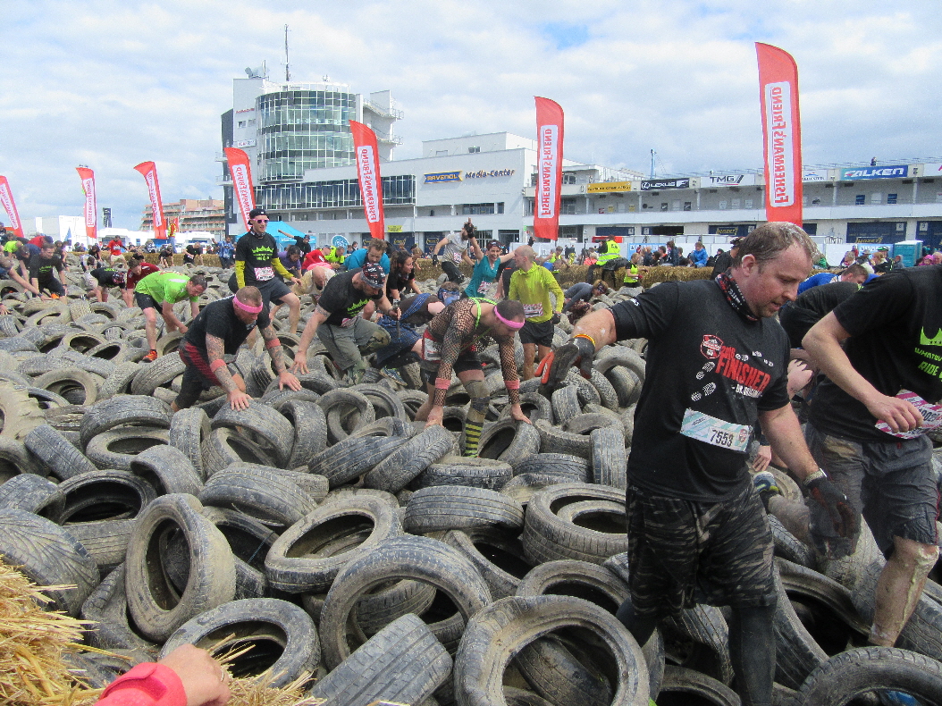 Die Eckdaten: Start ab 13h in vier Startblöcken mit jeder Menge Aktion - Mucke , ca. 13.000 Läufer, 12,4km laufen, 20 Hindernisse überklettern, durchrobben, überhangeln, überkrabbeln, durchschwimmen (wenn man kleiner als 2 Meter ist), durchglibbern und durchrutschen. Dazu ein sehr illustres Teilnehmerfeld: Römer, Wikinger, Putzfrauen mit Klobürste, Gitarrenspieler incl. Gitarre (allerdings aus Plastik), Anzugträger, muskelbepackte Sportsfreunde und und und.... Im Wege stehen Stromzäune, Modderlöcher, Wasserbecken, Modderhügel (wie sollte es in der Eifel auch anders sein), Schaumbecken, Halfpieps, Reifenfelder und der Haupthügel aus 3 übereinander stehenden Übersee Container. Da muss Mann und Frau erstmal hoch. Höhenangst ist da wenig hilfreich, zumal die Netze, über die man klettern muss, bekanntlich “durchsichtig” sind. Naja sonst wären es ja keine Netze. Dazu eine Kletterwand, die an die Turnunterricht in der Grundschule erinnert und schwups ist man ganz oben. Ein tolle Ausblick über das Gelände und eine riesige Rutsche ins nächste Modderwasser sind die Belohnung. Was will das Strongman(woman) Herz mehr? Dann noch über ein Container und schon ists rum. Mit 1:57 und Platz21 in der AK schon ein tolles Ergebnis.... Ein Top organisiertes Event, mit super warmen Duschen, schneller Kleiderbeutelausgabe (da kann sich so mancher Stadtmarathon etwas von abschneiden) und viel guter Laune. Grund genug, wieder zu kommen....